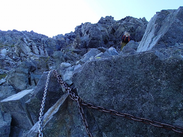 6:41 2800m地点 ここからスリル満点の登りとなります。ヘルメット着用。(剱岳はヘルメット着用を義務付けたいものです。)