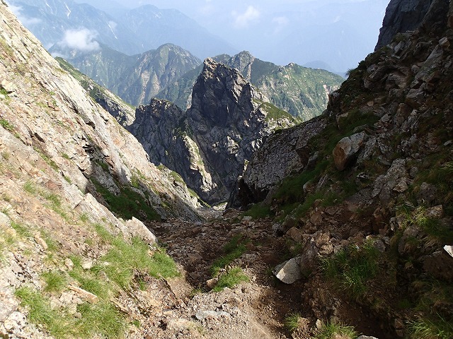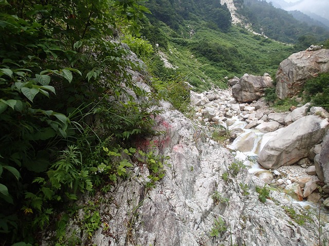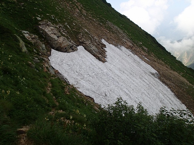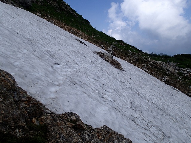 最後の雪渓を通過した後、道を見失ってしまいました。下がりすぎたようです。思い切って上がったところ登山道にぶつかりました。踏み跡がはっきりしません。すれ違った方も、雪渓で迷ったようです。