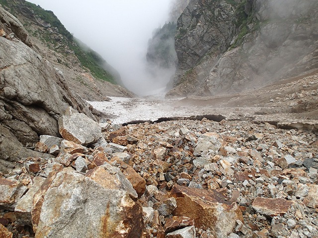 14:25 アイゼンを取り付け、雪渓をひたすら下ります。耳は落石の音に集中しています。