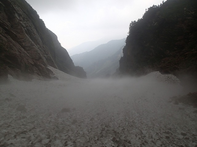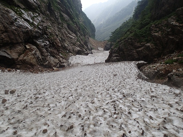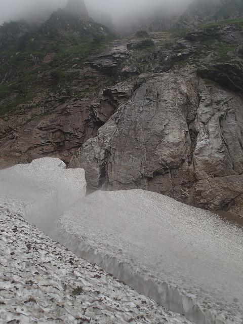 雪渓も後半になってきました。最後の雪渓の崩れ具合が気になり始めます。