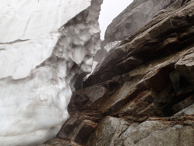 二カ所目、ここも雪渓の隙間から下へ。アイゼンの歯がつるつるの石の小さな隙間にうまく引っかかってくれました。