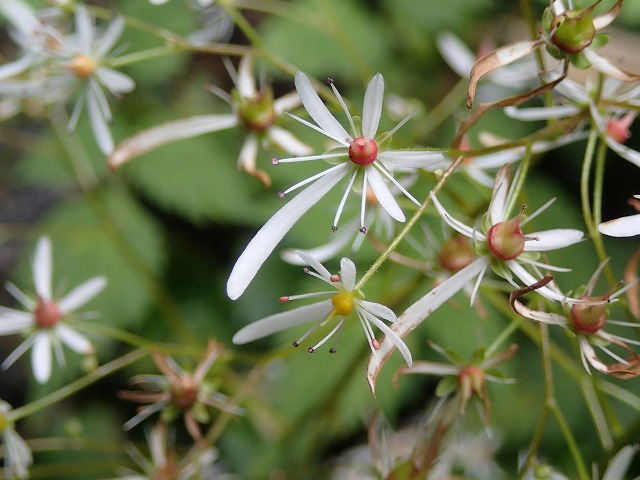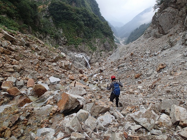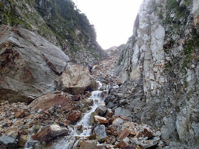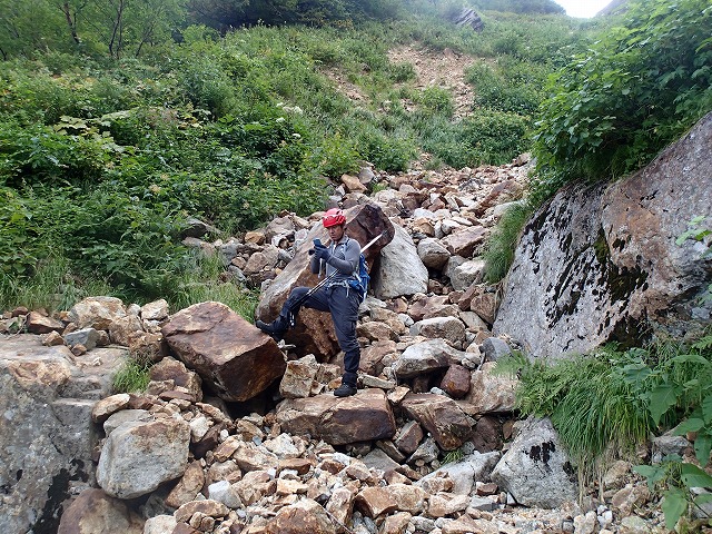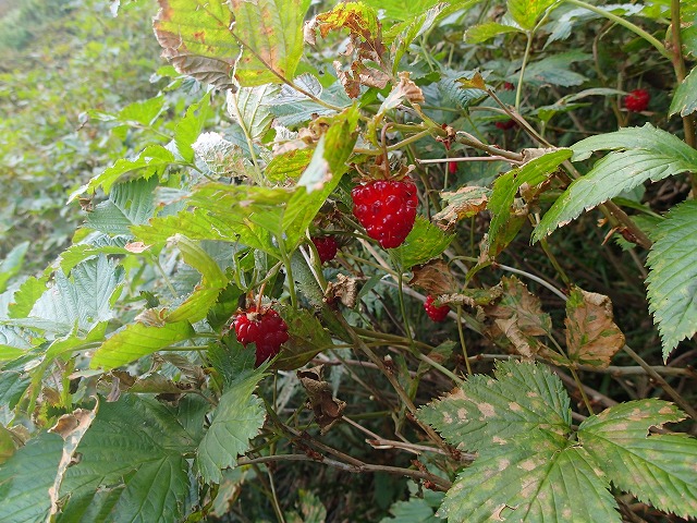 西仙人谷出合いを過ぎてからの登りは、本来のコースではなく右の谷を登りつめることに。きわどい登りもありましたが、ガレ場の具合は、左より良いようです。後半は、ベニバナイチゴの群生地を藪こぎすることとなり、大窓の少し上に出ることができました。(ベニバナイチゴの実は、ヘタが茶色くなったものが甘くなっています。)