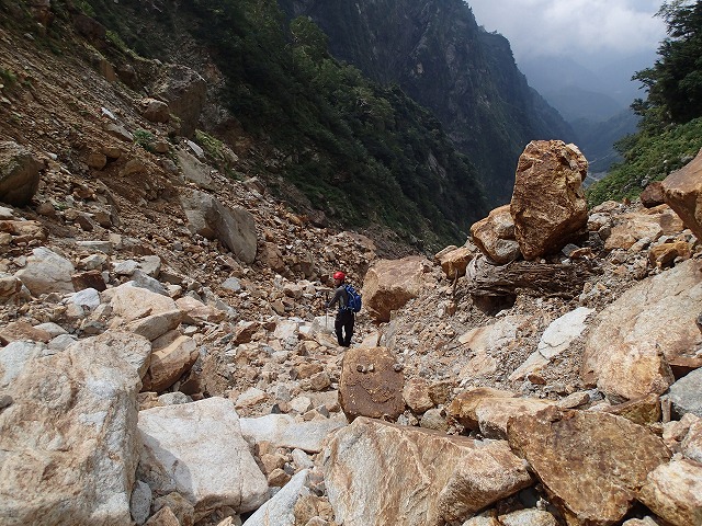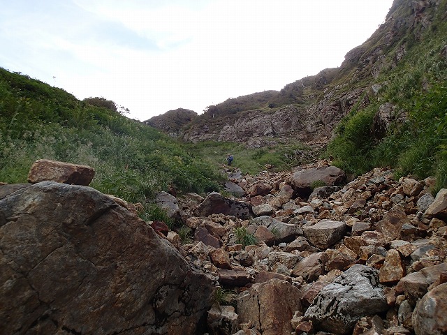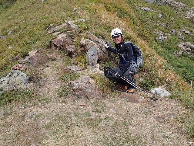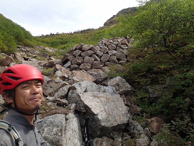 大窓にある「お地蔵さん」からの下りは、登山道があり、途中に旧鉱山関係の人工的な石垣があったりと快調でしたが、途中からガレ場に入り、気が抜けない下りとなってしまいました。