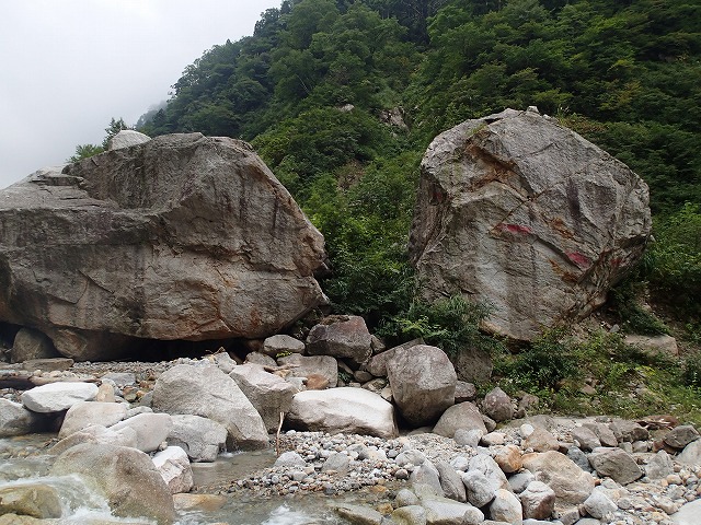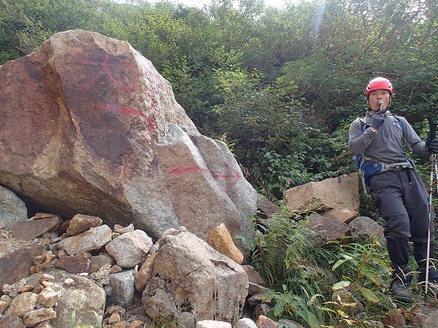 登山道を抜けるとガレ場が。大きな石に矢印があり、ここが正式ルート。