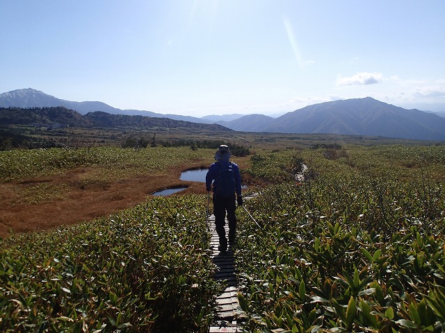 下りは、横目に今日縦走してきた、奥大日岳の山並みを見ながら、木道をひたすら下ります。