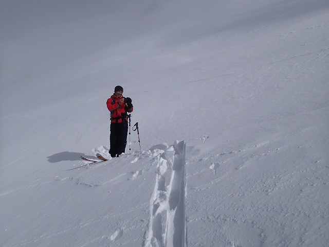 私も心配でしたので、先ずは斜面を確かめにハイクしてみました。雪はしまった状態でしたので、できるだけ中心を避けてのハイクとなりました。