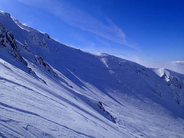 最後の急斜面。気を引き締めていきます。斜度としては、毛勝山の雪渓の方がきついようです。
