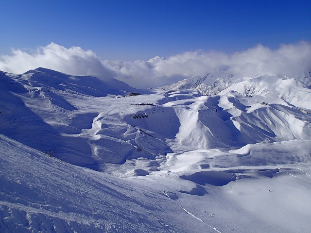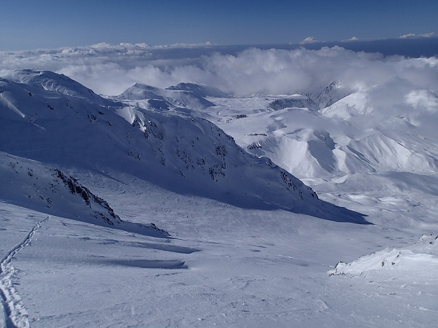 山崎カールから、一ノ越方面にトラバス。極力下らないようにします。室堂まで滑降して移動しなければなりませんので。ルート取りに注意。
