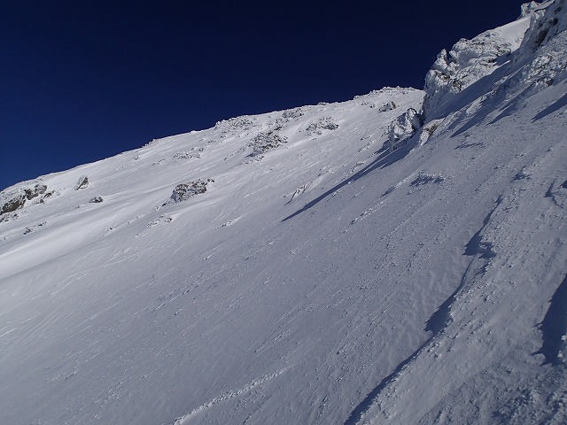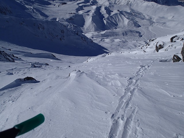 13:19 滑降開始。 前半は氷の斜面にところどころに岩がでており慎重に。
