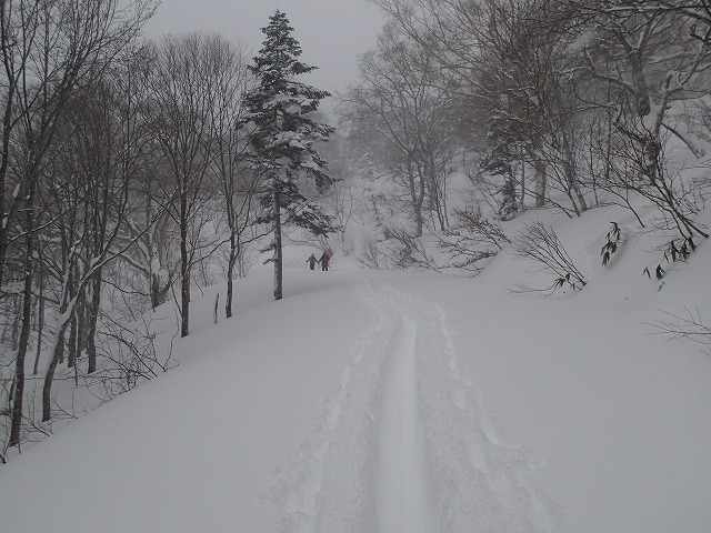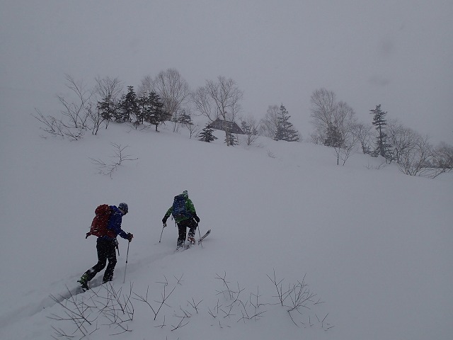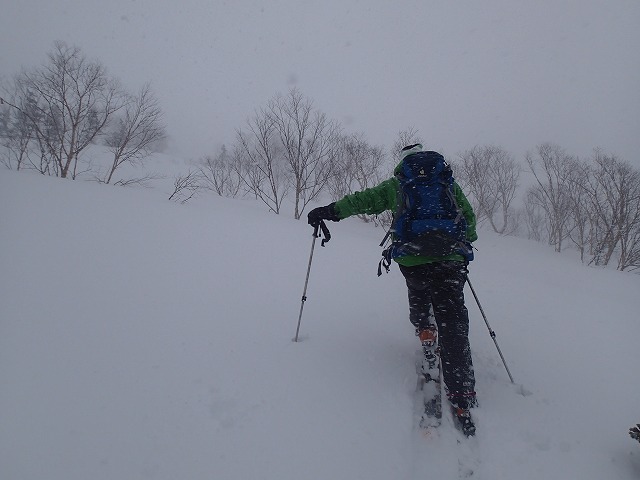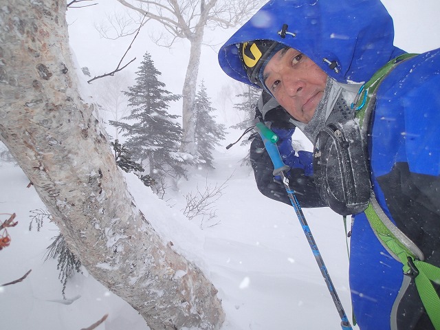 3人で交代しながら、急斜面をクリアー、いつものダテカンバの樹まできましたが、気温は、ー10以下、風も5~10mほどでしょうか。体感温度もどんどん下がっていきます。