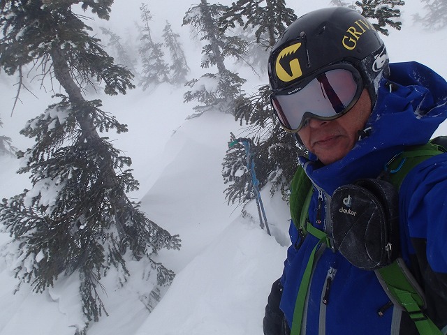 12:34 樹の陰に入って滑降準備。まったく風避けになりません。慎重にシールを剥がし滑降開始。