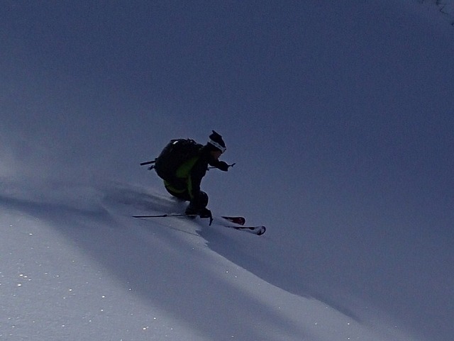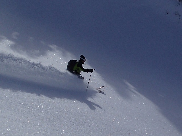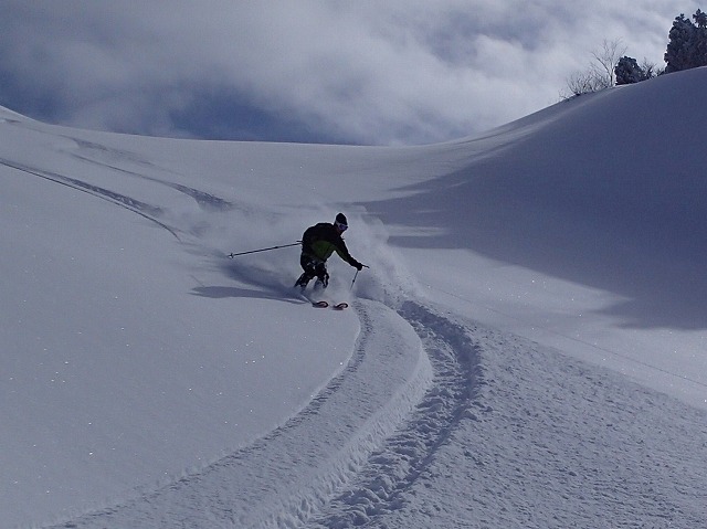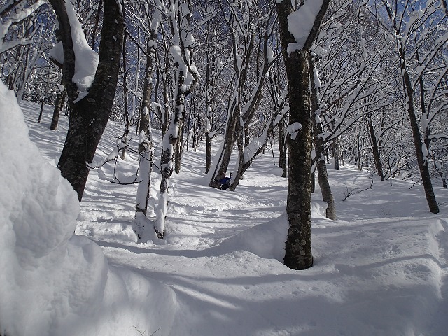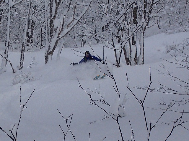 ここからが、本番です。林の中のパウダーを泳ぐように滑ります。
