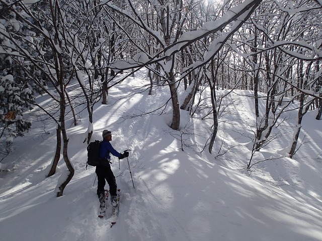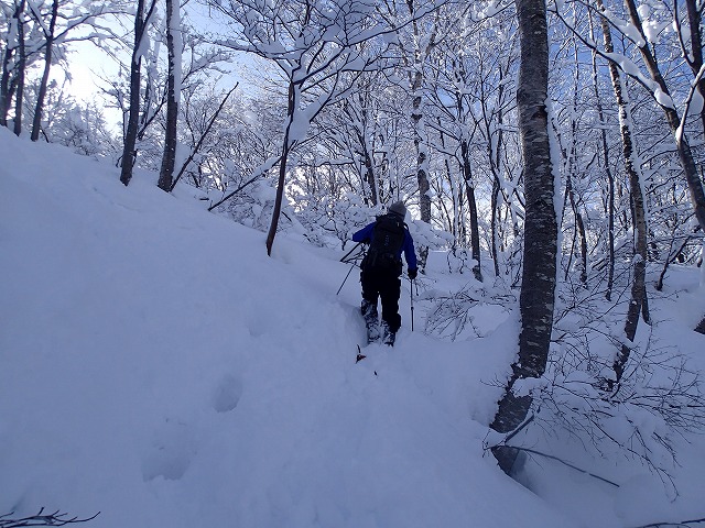 今度は、林の中のハイクが続きます。トレースがあるので楽なはずなのですが、スノーシューの跡がシールの効きをよわめてしまい、ずるずる落ちることも。