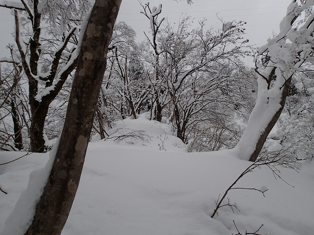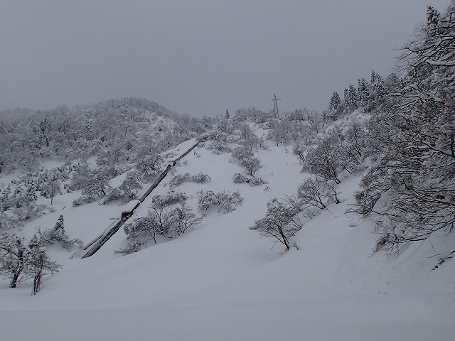 ここは、尾根まで上がり美味しい斜面を滑るしかありません。
