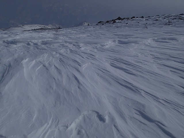 確実に風速10m以上は出ています。風が強いせいで山頂・ケルン周辺には雪が積もっていません。