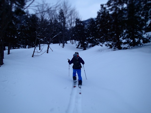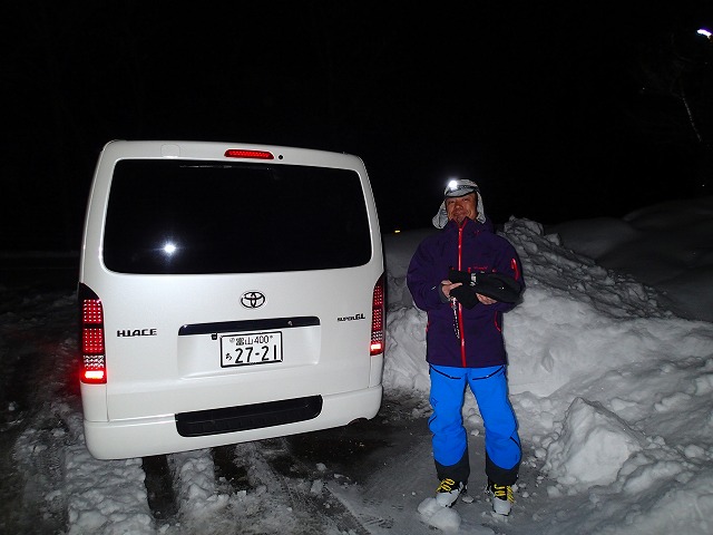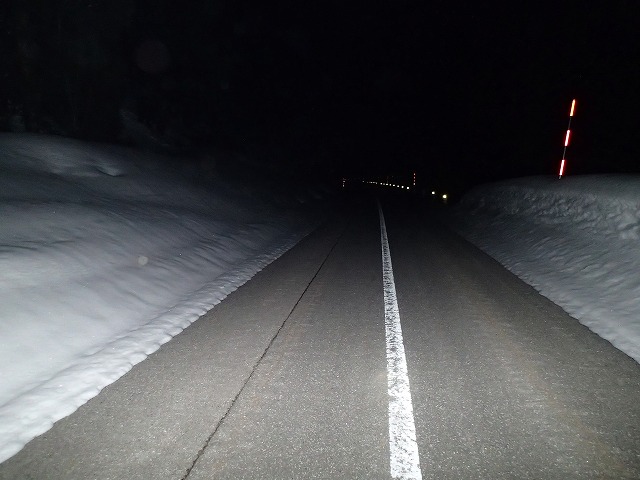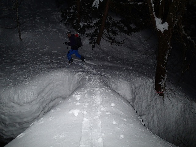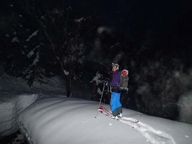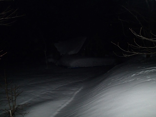 トレースがあることを期待しましたが残念。クラストした雪を踏みしめながら暗闇の中を進みます。