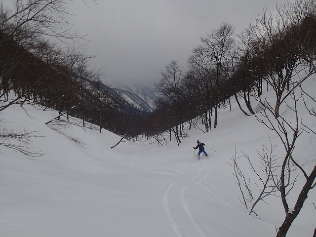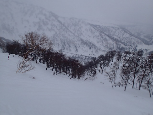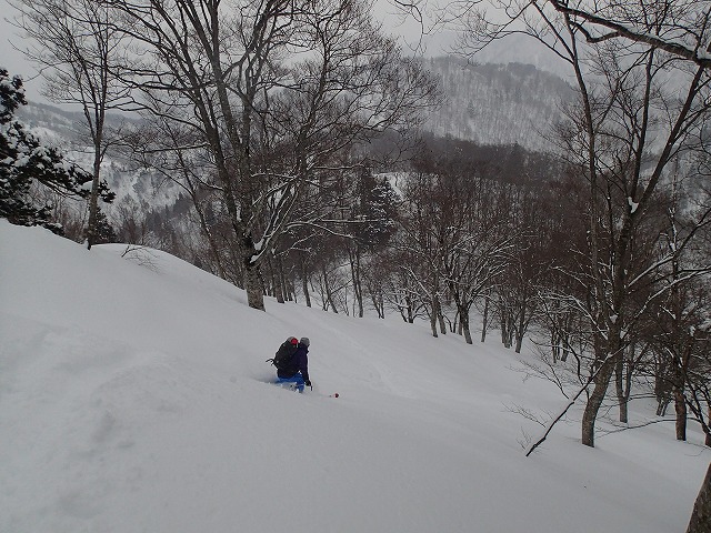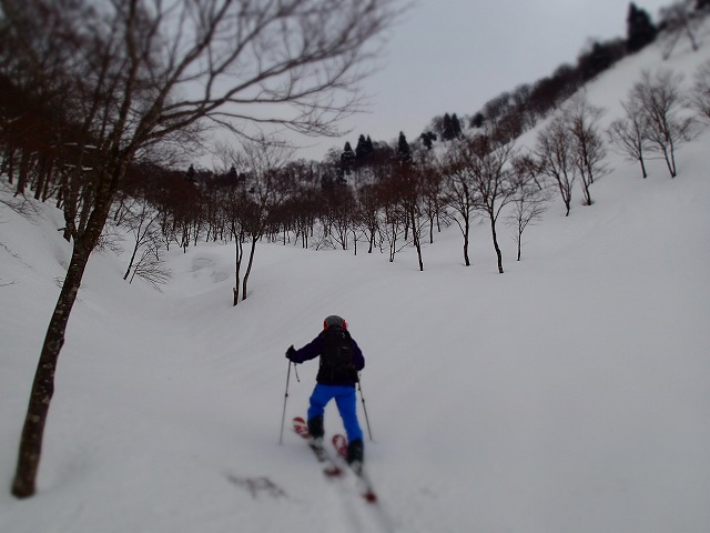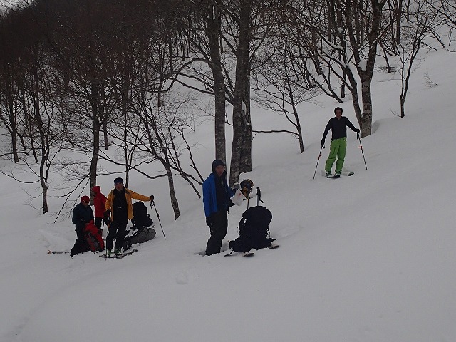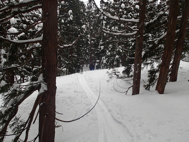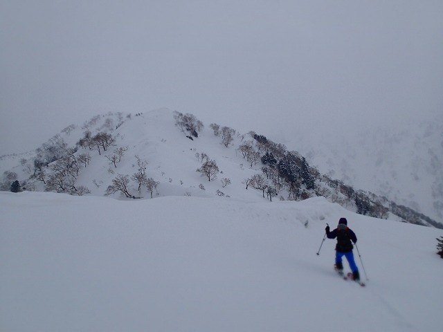 どうせここでシールを付けるのであれば、雑穀谷まで滑降し、そこからの登り返しでそのまま1778m(前大日岳)のピークをクリアーした方が一石二鳥と判断したのでは。