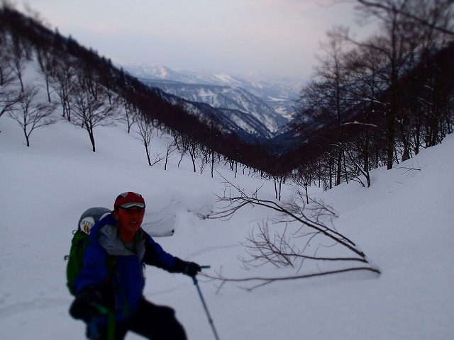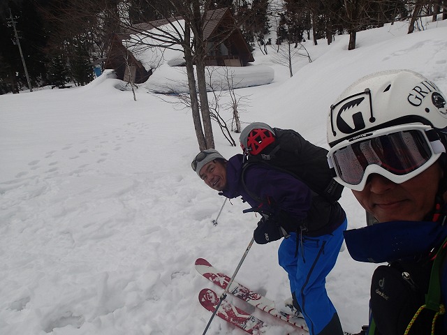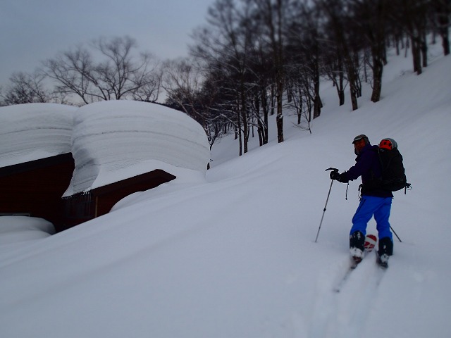 前線基地までの斜面が最高でしたが、その後はモナカ状態の雪面をヒーヒー言いながら滑降して行きます。