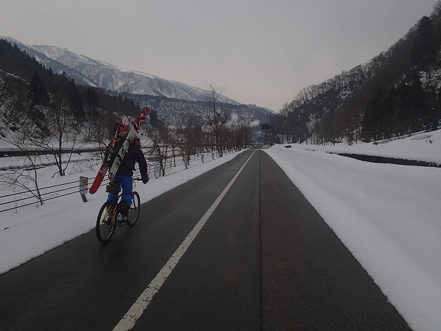 湿雪に悩まされながらもクムジュンに無事到着。自転車で小雨の中を藤橋ゲートに下って行きます。