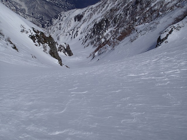 広い谷がまだまだ続いています。斜度が緩くなり、雪も緩んできました。