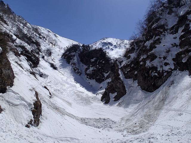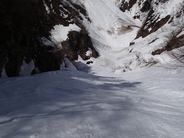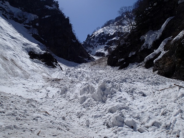 滝を通過後に試練が。大きなデブリが谷をふさいでいます。このデブリの中もスキーを外すことなくどうにかクリアー。