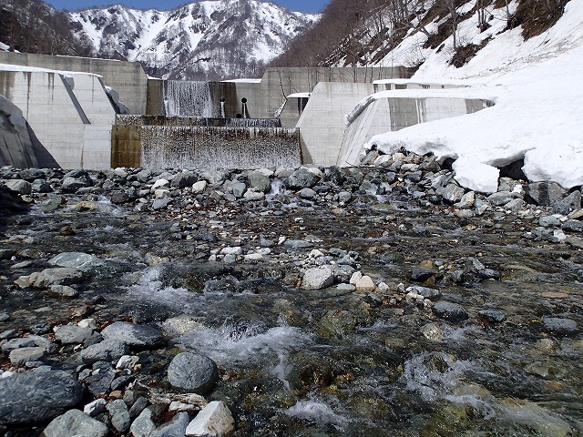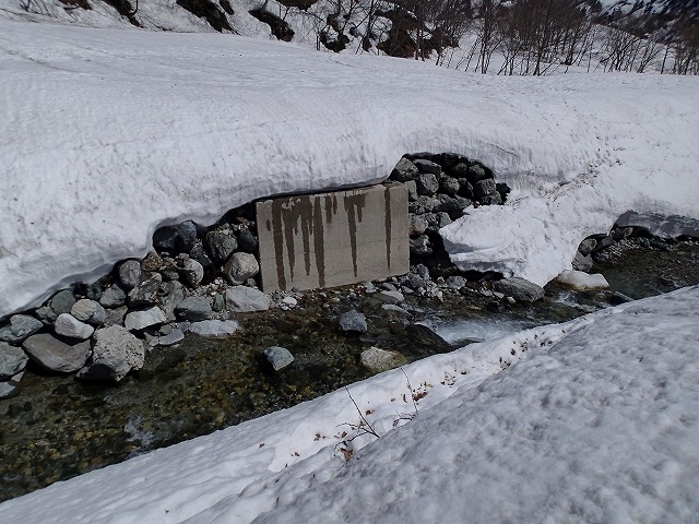 渡渉地点に向かいます。ここは、スキーを外しザックに挟んで渡渉しなければなりません。