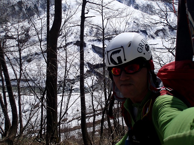 スキーを脱がないでトラバース気味に高巻きポイントに侵入したことにより、階段登行を少し入れただけで、高巻くことができました。