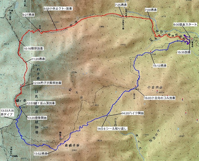往路:6時間53分 山頂滞在:27分 復路:2時間15分 計9時間35分