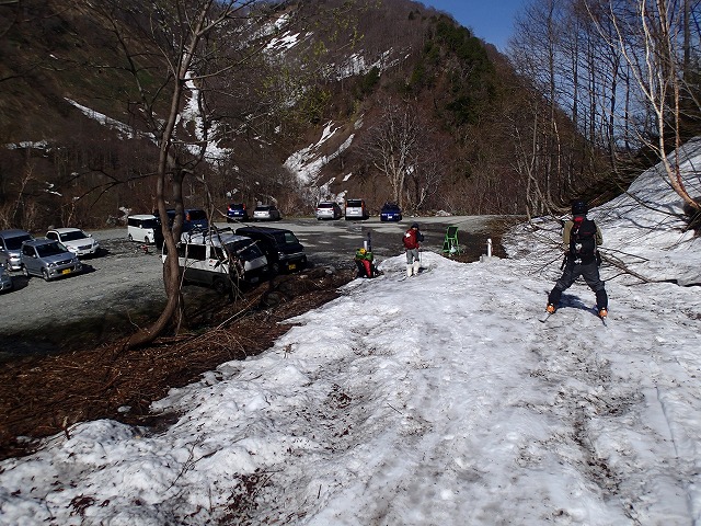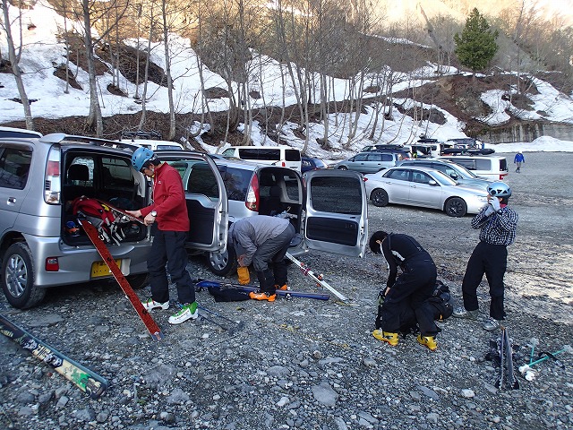 いそいそと準備をするメンバー。猿倉の駐車場には、20台ほどの車が止まっています。