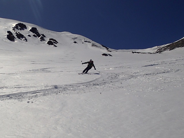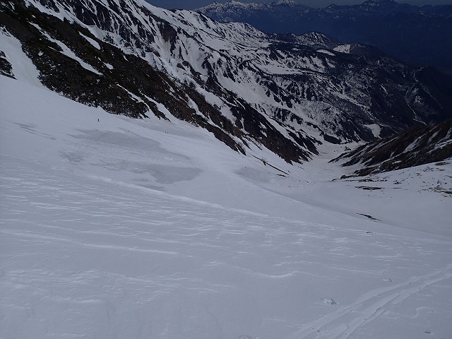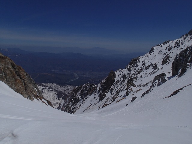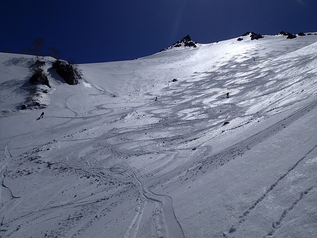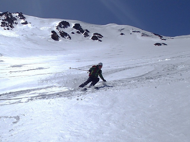 直登ルンゼにダイブしてきました。スタートは、45度ほどでしょうか。途中のノドがポイントになります。今日は、ここを滑降するのにベストの日のようです。ここは、天狗蔵君たちと行くことにしましょう。