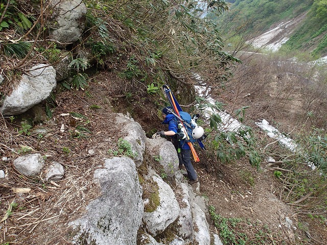 スキー装着後は、快調にハイクを進めます。やはり、デブリの跡もあり、昨年ほどの素晴らしい斜面とはいきません。
