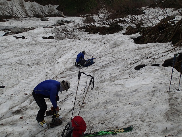 スキーで行けるところま行き、シューズに履き替えます。