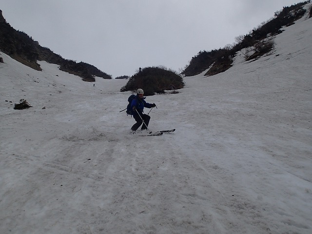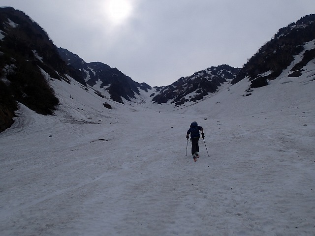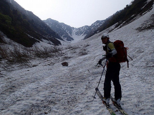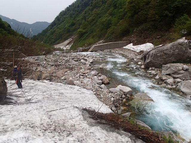 目の前に南又谷が飛び込んできます。昨年よりも確実に雪が少ないようです。特に最終堰堤を越えた後も徒歩で進まないといけないようです。