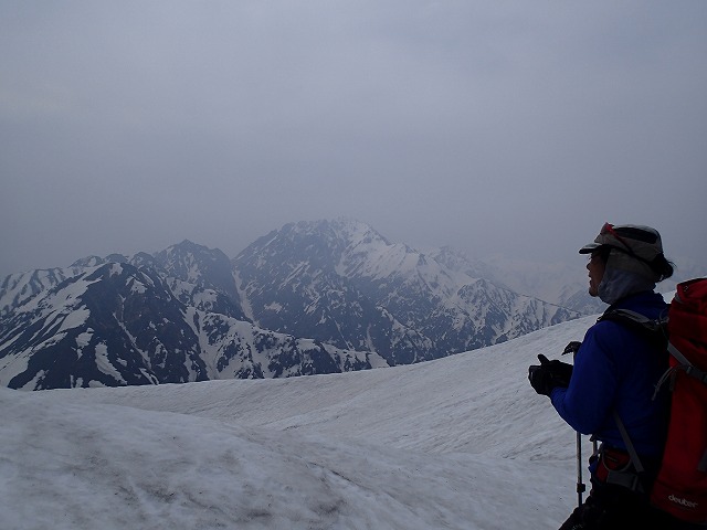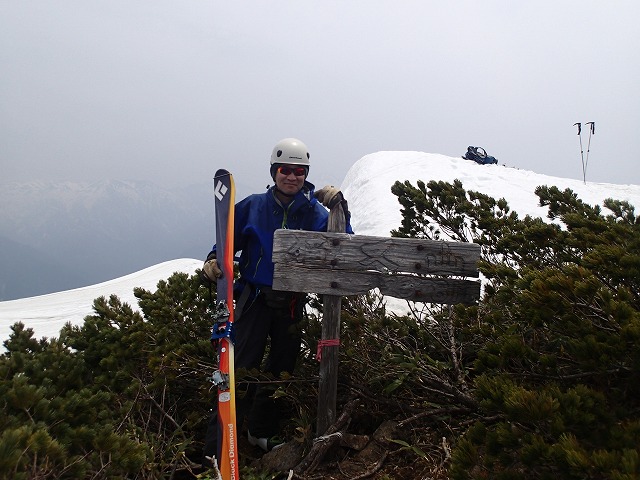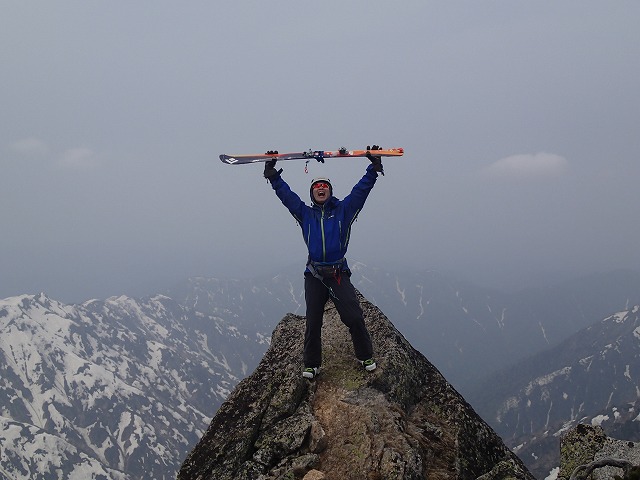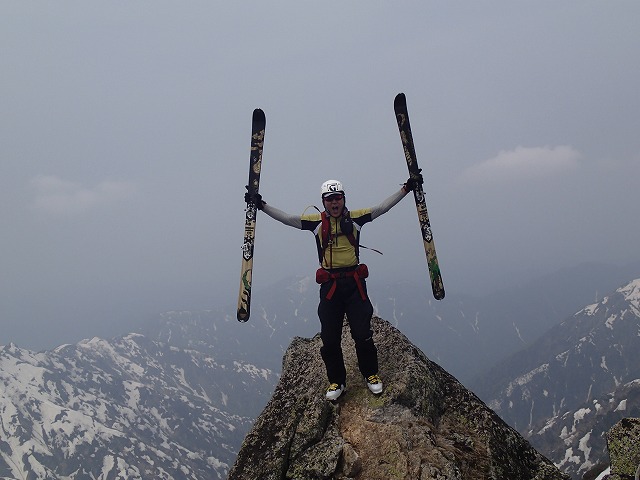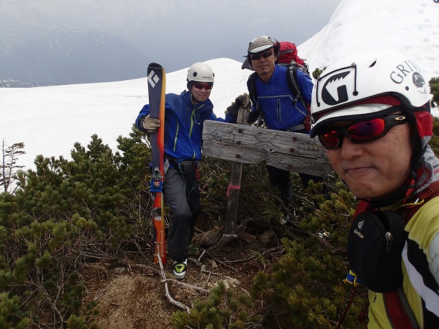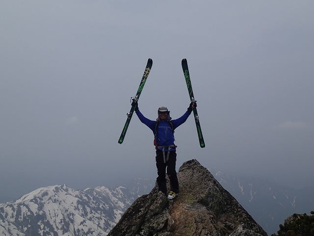 山頂では、写真を撮ったりしながら、3人でマッタリ。毛勝山にガスがかかってきたので、あわてて滑降することに。