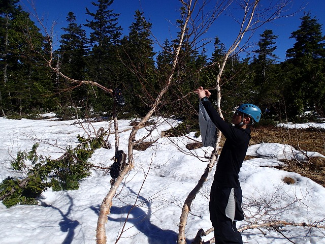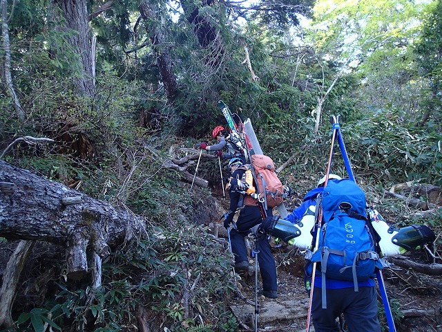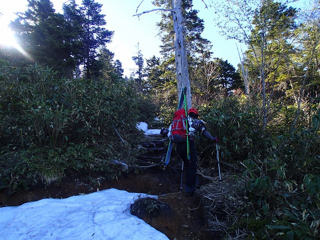 シューズに履き替えてからは、忍耐の下りです。スキーのテールがひっかかり、こけそうになりながらも慎重に下っていきます。