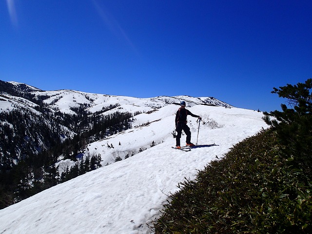 尾根沿いに滑降。本当は、左側の「金作谷」にダイブしたいのですが。帰れなくなります。