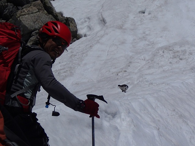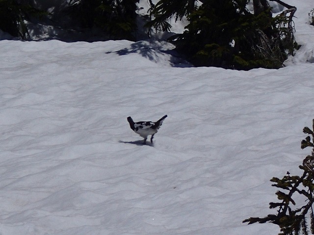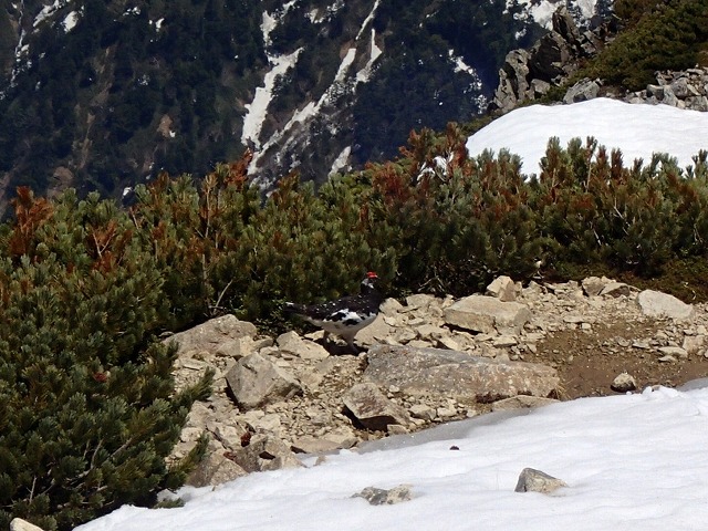 今日も晴天です。こんなに晴天なのに「雷鳥」が歩き回っています。山頂に着くまでに6匹は見たでしょうか。つがいで雄の羽が色づき始めています。