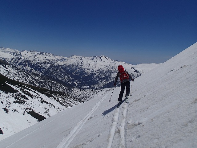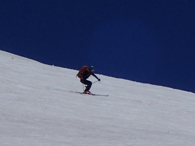 このトラバースの際、クライミングモードで滑降して縦溝にはまって、前ころびしてしまいました。(やばかった)