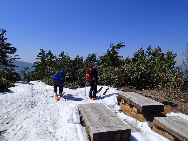 スキー靴のまま三角点を目指します。この下の斜面も雪が付いていました。そこまでスキーで行くことに。