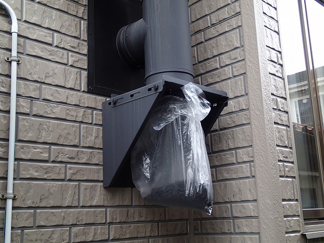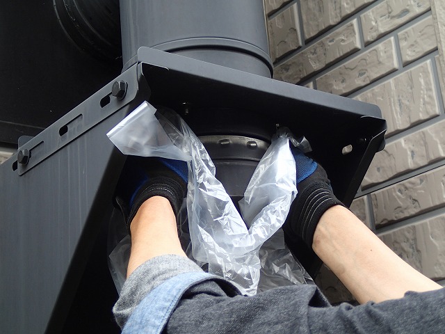 外に出て、煙突掃除。下のふたを開けるときも、周りが汚れないようにゴミ袋をかぶせて開けます。