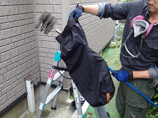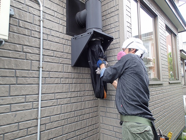 白いホースは、粉じん用掃除機の吸い取り部分。それを当てながらブラシでたまったススを外に出します。これがプロの技。