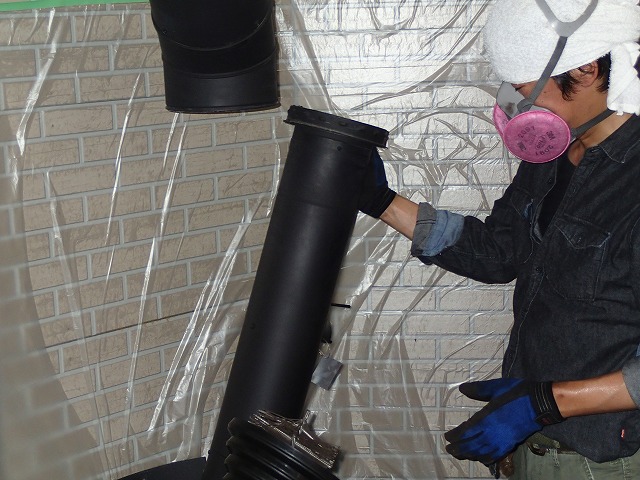 外で、室内の煙突を掃除。下に置いたものは塗料を入れるカン。これが煙突とぴったり。ススはすべてカンの中へ。