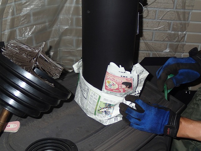 先ずは、ストーブの周りにシートをひき、部屋が汚れないように配慮。
