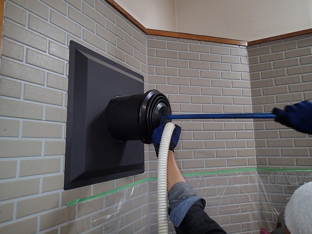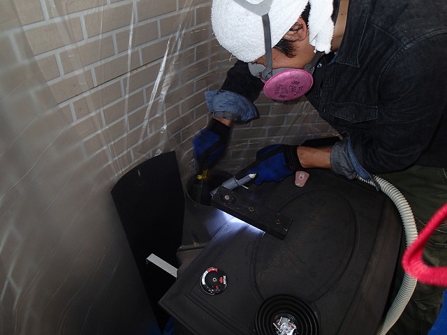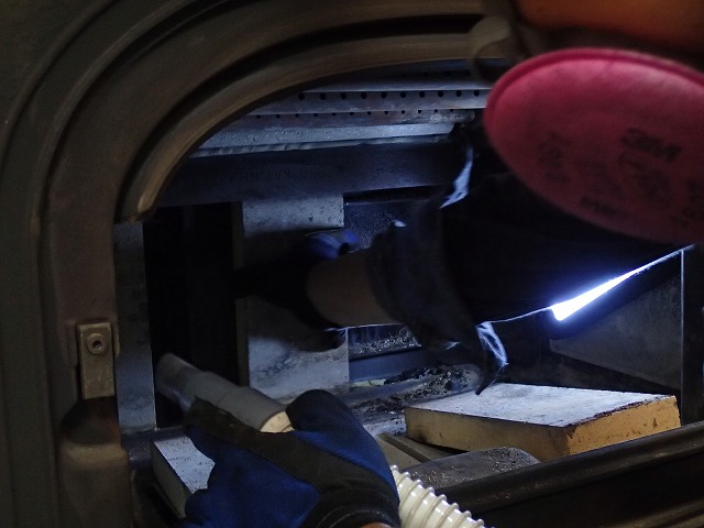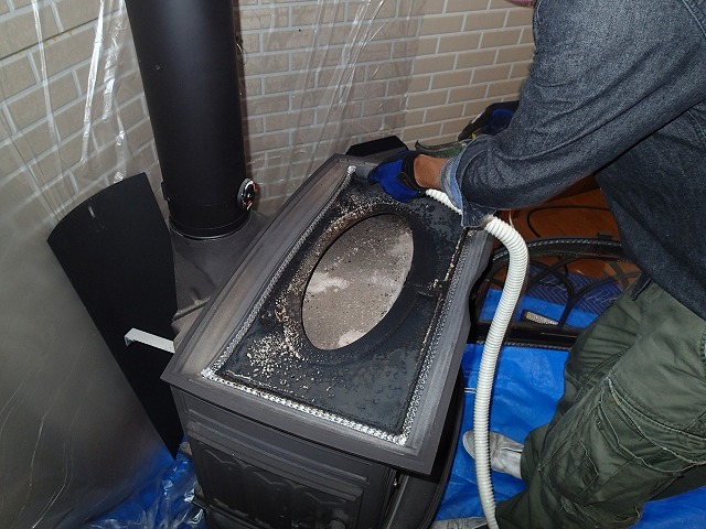 金ブラシでこすりながら、粉じん用掃除機ですべてのスス・灰を吸い取っていきます。