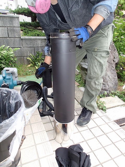 流石、二重煙突です。煙突内部にこびりついていた燃えカスも、さらさら状態でした。量も多くありません。乾燥した薪を燃やし、うまくストーブが燃焼していた証しだそうです。