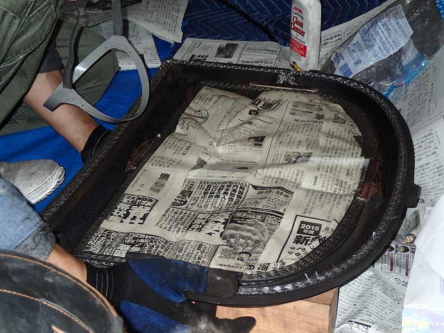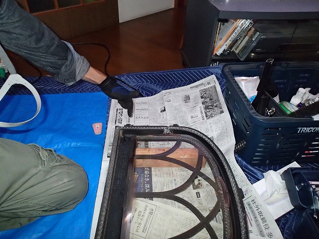 正面のガラスも、コンパウンドと金たわしを使って頑固な汚れを落とします。