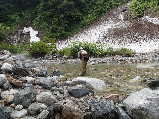 まだ雪が残った渓流です。雪渓の下の流れは、水温が低くなっており岩魚の活性が上がっていません。