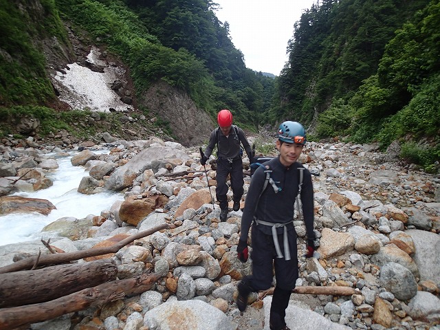 大ちゃんは、登山靴を抜いて冷たい水に挑んで渡渉。私たち三人は、流木を利用してジャンプで渡渉に成功です。