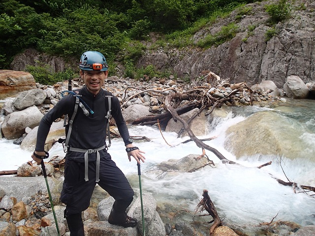 今回、雷岩の下流で渡渉を行いました。前日の降雨により、白萩川は増水しています。
