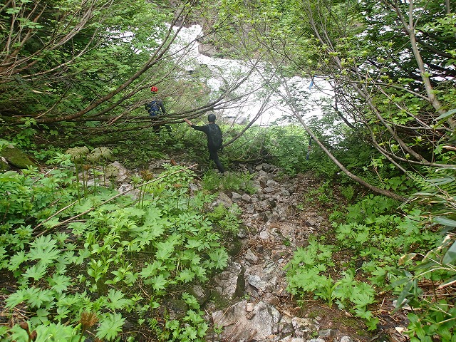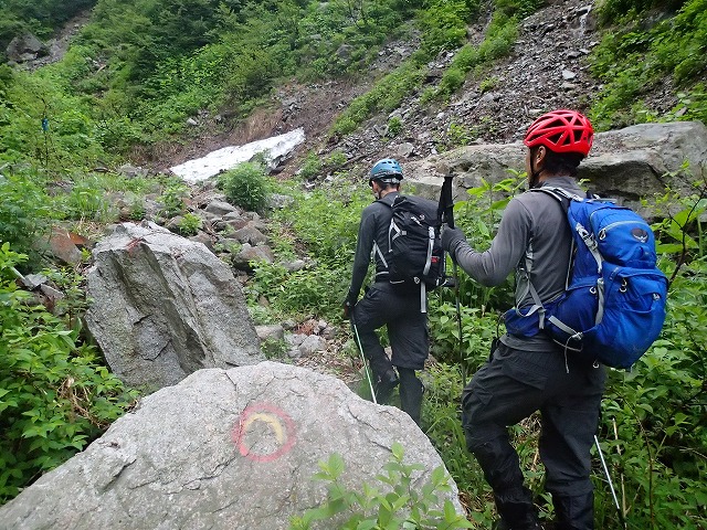 天狗蔵君の赤いヘルメットが目印になります。雪渓が見えてきました。